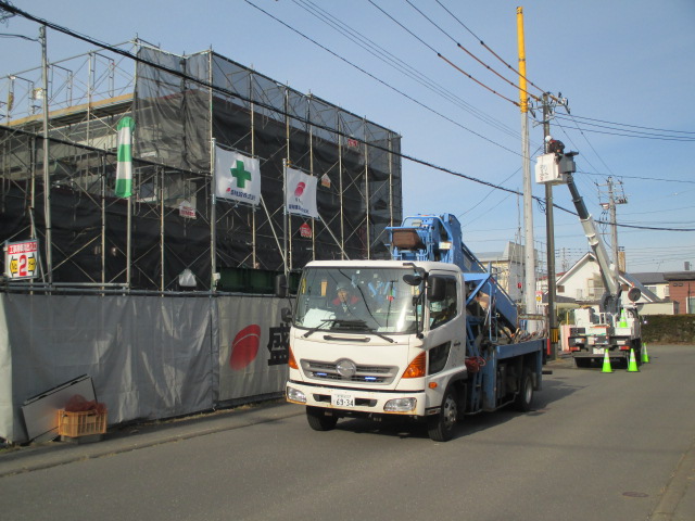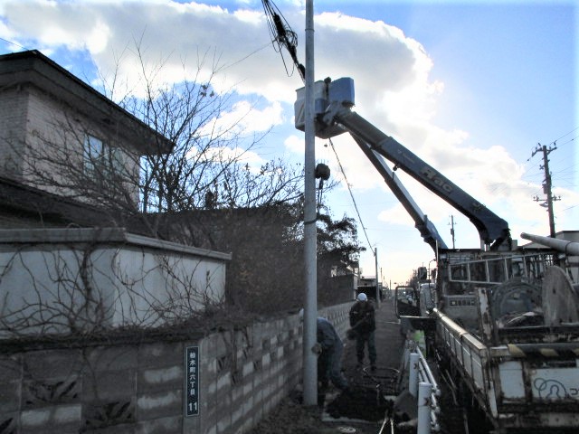 既存の電柱を建替えます。ケーブルが複雑についているので、作業には細心の注意が払われます。