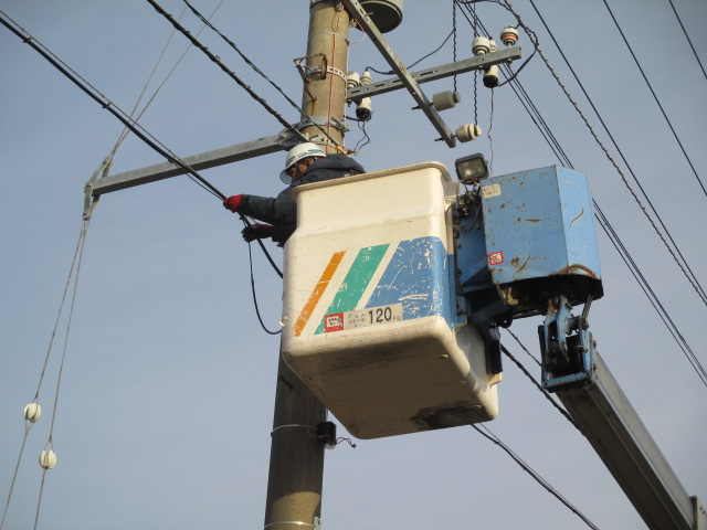 電柱と電柱の間にケーブルを敷設します。高所作業なので危険が伴います。